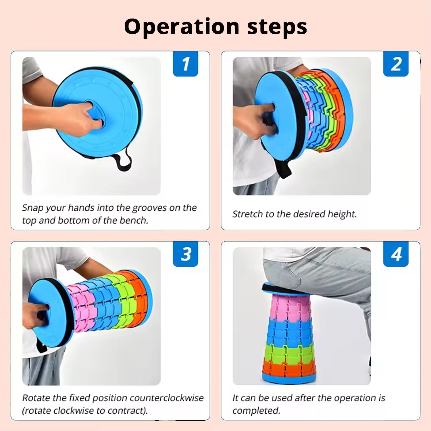 The new design allows you to open & close this retractable stool in 1s! You can grab both ends and gently rotate them in a counterclockwise/Clockwise direction to open or close. And it locks firmly in place once opened. Even a child can do it quickly and easily!