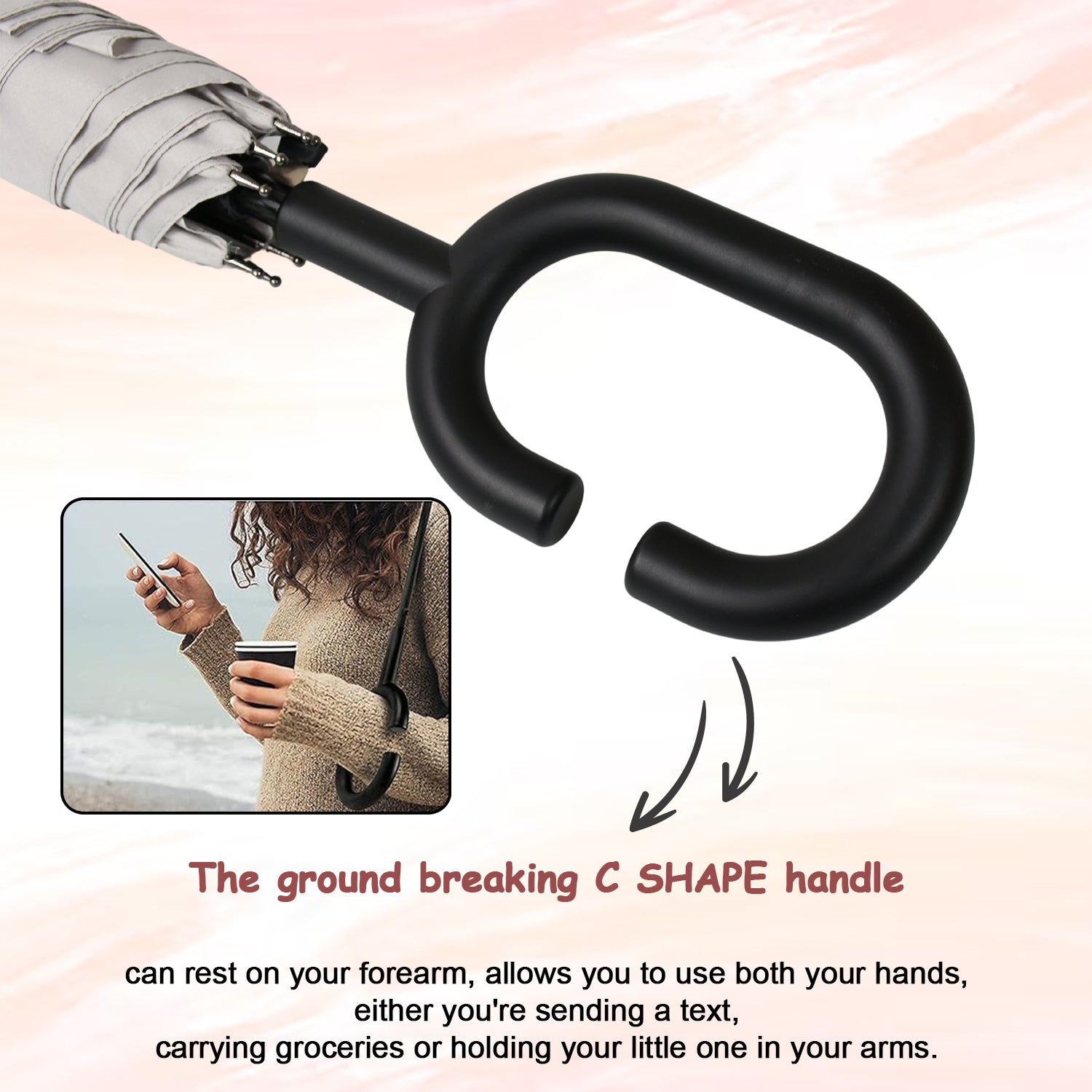 - ERGONOMIC C-SHAPED HANDLE - Walk comfortably hands-free while answering your phone calls, handle grocery bags, baby, or even grab your kid’s hand. The comfort grip C-Shaped handle allows you to slide over your forearm or wrist so you can attend to what is more important.
